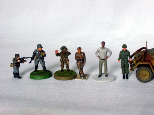 West Wind 28mm German half-track MG gunner; BTD 28mm German; BH 28mm British ATG commander; 1:48th Bandai 251/1 crewman; 1:48th ‘Preiser’ civilian; 1:48th HUMVEE w/TOW crewman (Chinese mfg TOW HUMVEE, OH-6 & M113A2 in 1/48)