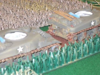 Two Mark IV tanks. Tank w/o side skirts is a repainted SOLIDO 1/50 Mark IV/G. The model with the side skirts is a Bandai Mark IV/H kit. The new TAMIYA Mark IV/J is a similar model except it has a metal lower hull.