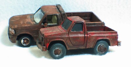 A 1/43 current pick-up truck in the background, a bit weathered by me, for use as a TECHNICAL. In front of it the "RODEO" is the TAG 1/60 scale pick-up truck for their TECHNICAL.
