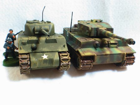 An ACADEMY Tiger II behind a repainted SOLIDO Tiger I. The Tiger 2 has had its tracks replaced with resin tracks. The Tiger I has been completely repainted as the original vehicle was in panzer dark gray with metallic aluminum tracks.
