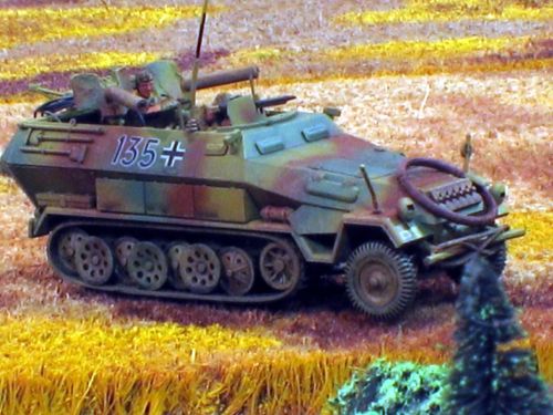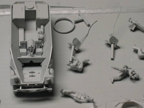 251/1C by Bandai converted to a 251/16. You are looking from the font at the added fuel tanks, one per side, and the pressure tank in the middle. The holes are for the three flamethrower fuel lines - the two large projectors with line can be seen to the right. The HMG in the upper right is a 14.5mm Soviet AA gun going on another conversion (WWII AA HMG GAZ truck). The circular object is a roll of barbed wire that goes on the front of the half-track. Four of the five crew figures can be seen - the driver and radio operator (sitting), the LMG gunner (with helmet - he is from the TAMIYA PzGr box), and one of the flame gunners which is a figure from the kit. This is a color shot but I have just brought it in after undercoating the vehicle and figures in gray.