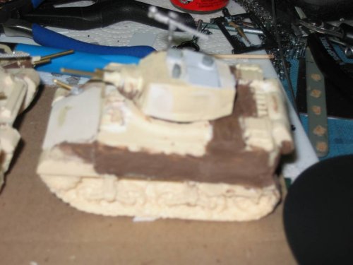 A bad picture showing where I added parts of brass, aluminum, plastic, plastic card and the reliable Elmer's Wood Putty (in dark dog s… color). The other vehicle to the left is almost done and is a Qtr-Kit 1/48 221 German armored car.