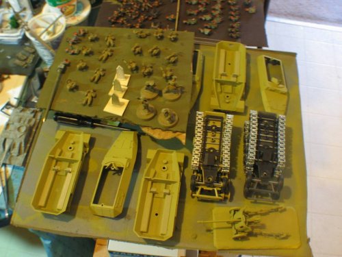 All of the figures showing (flash) reddened flesh are Soviet crewmen (to left of the 'stick') and US crewmen (to the right). On the larger cardboard tray with the 3 tombstones is a British 17 pdr Para gun crew and the British crews. You are looking at two panzer yellow and two panzer gray (total 4) 251/1 from Solido, all painted solid panzer yellow. I obviously didn't do two under carriages, but will cover most of that in mud/dirt anyway, including the aluminum tracks.