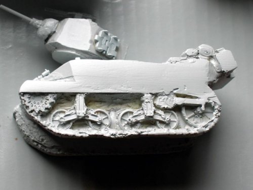 Side views showing the flattened armor and raised rear deck. This hasn't been sanded yet, and I took a straight edge and dental pick and extended the line of the skirt the length of the vehicle. His track isn't too bad - I make the 'junk' either mud or dirt.