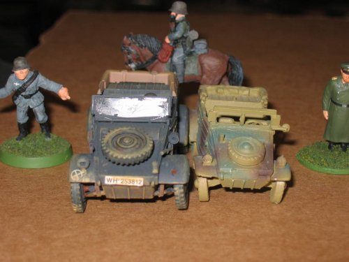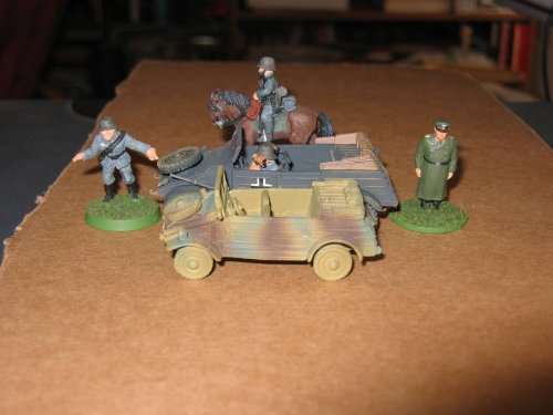 I also shot these. Figure on the left is BTD 28mm. Cavalryman is a FOUNDRY 28mm. The figure on the right is a 1/48mm BANDAI (36mm). The grey KW is a TAMIYA 1/48 kit with a WW driver. The camo partly done KW is a West Wind 1/60 KW. The TAMIYA KW is the same size as the BANDAI Schwimmenwagon and the BTD KW. Please note the two 28mm figures are mounted on plastic GW bases while the 36mm BANDAI officer is mounted on a washer.