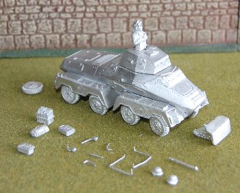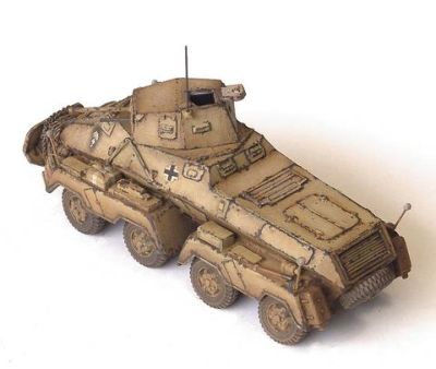 | Long Review: | Designed with all wheel drive and steering, the chassis was extremely advanced for its time and gave the vehicle excellent cross country performance. The first vehicle in the series was the SdKfz 231 (8-rad). Introduced in 1937, by late 1940 it had all but replaced its predecessor, the SdKfz 231 (6-rad). Improvements over the earlier series included a new superstructure, which was of all welded construction and following combat experience the armor thickness was also increased to 30mm. In addition the vehicle was also fitted with a radio, where its predecessor had not. This 'big' gem is (as is the Chieftain style), an all-metal kit of the standard early-war German armoured car. The parts all fit together extremely well, some even being almost friction-fit. The degree of craftsmanship is evident in every part, from the hull to the smallest detail fitting. The sheer number of small extras can appear somewhat overwhelming when first looking at the kit, but the way the hull and mudguards are broken down actually makes a lot of sense, as it allows the complex shape to be easily and accurately reproduced. The many extra bits also allow a fair degree of customisation, which is so very typical of the way vehicles were used in the desert. The bits include stowage and a half-figure commander. There are no instructions included in the kit, but they are available for download from the Chieftain Models website. They take the form of what appears to be about a page of clear drawings and instructions. |