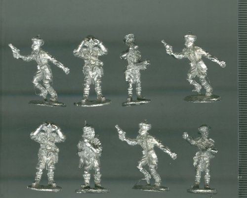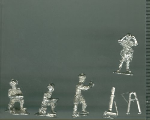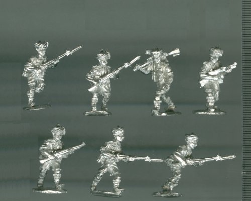 | Long Review: | Hmmmm. Where to start? When I first opened the pack, the very first thing that went through my mind is something along the lines of OK, they're tiny and really rough, but once I started examining them, they really look like what they're supposed to be. They also have a fair amount of "hidden detail", most of which will only show up during painting. The figures are true 25mm, which meant that they are tiny by all modern standards, but that doesn't mean they won't work with the newer figures. When I think of the Sikhs and Punjabis, for example, they always appear smaller than Westerners, so these will be a good match with the larger figures. The other thing is that these figures are an older range, and the moulds and sculpting are starting to show their age. The finish is rougher than what we are used to today, and there is a fair bit of flash and some vents, but it is easy to remove and clean up. The four packs I have represent the entire range of Punjabis- a command pack, riflemen, some MG and AT rifle support as well as mortars. The command consists of a variety of officers and NCOs, while the riflemen are a mixture of rifle-armed soldiers (some with fitted bayonets, others without), one Bren-gunner and a Thompson gunner. The heavier weapons consist of a walking Boys rifle team, a prone firing Boys rifle team, and two firing tripod-mounted Vickers teams. The mortar pack consists of two mortar teams (two kneeling, one standing per team), the mortars, and an observing officer. |