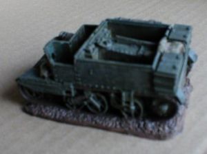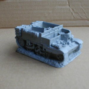 Long Review: | The Universal Carrier which I received is cast in one part on an integral base, and contains a few small metal parts and the crew. There are some neat illustrations on the BAM website showing where the metal bits go. The underside of the body required a little cleaning- it's the moulding plug, and also a small number of bubbles in the resin, which are easily filled. The model captures the look of the carrier rather well, and, although I can't decide whether it is a Mk I or a Mk II (the differences are so slight that it will work as either). |