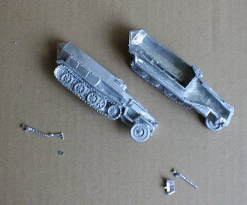 | Long Review: | The subject of this review is the riveted version of the SdKfz 251 Ausf C halftrack, always a useful addition to any German force (and, quite oddly, also for some units of late-war Russians, who used many captured German vehicles to alleviate material shortages). The choice of vehicles is good- the "C" model was introduced in 1940, and officially phased out in 1943, but many soldiered on to the end of the war. This particular model is cast entirely in white metal, consisting of a left and right hull, the MG shield and two MGs. While I applaud the method of sculpting, I must say that I'm more than a little puzzled by the position of the joint line- it runs dead centre from the front to the back, splitting the model into near-mirror-image left and right halves. This means that there is an ugly (and VERY hard-to-fill) joint line on several flat plates with details cast on them. When seen in conjunction with some slight deformation of the metal, the joints are really a problem. The fact that the metal around these joins is rather thick, though, means that bending it straight is not really an option, as the parts will probably be damaged quite badly in the process. I, personally, would have tried to hide the join along a natural join line. That aside, the model is actually very good. The detail on the wheels and tracks is brilliant, and the metal is quite thin where required.The other (minor) quibble is that the magazines on the MGs are on the wrong side. |