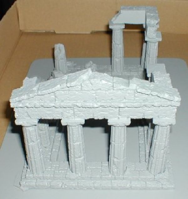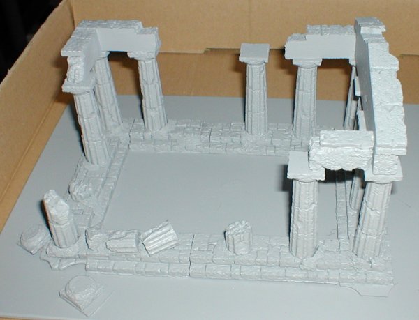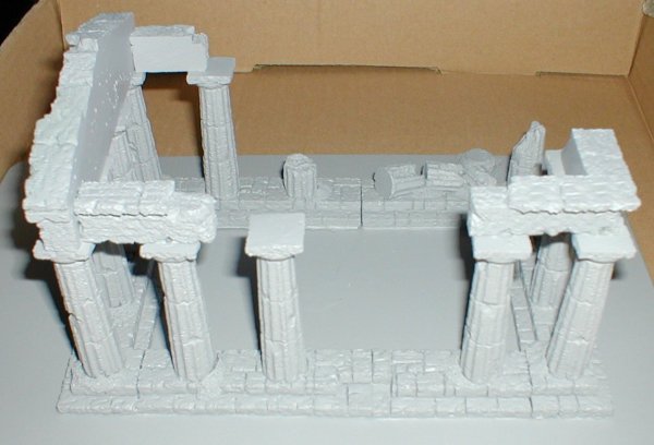 | Long Review: | This is a wondeful piece of terrain. It is supplied in a hard, grey resin, which already looks suitably "stony". The detail is perfect- lots of rough weathering, and a number of broken pillars. I received the foundation (6 pieces, with Greek letters inscribed to indicate which pillars fit where), 10 complete pillars and one half pillar, 12 pillar-ends, and five pieces of the lintels and roof. The piece is suitable for any period in the last 2500 years, as ruined temples are relatively plentiul, and even at the time it was built, ruins abounded, especially due to sackings and natural disasters. |